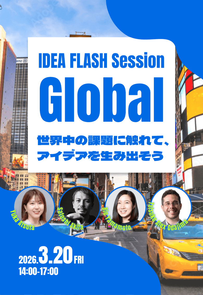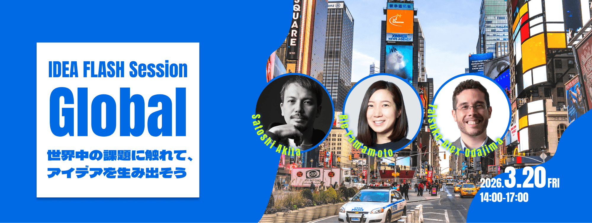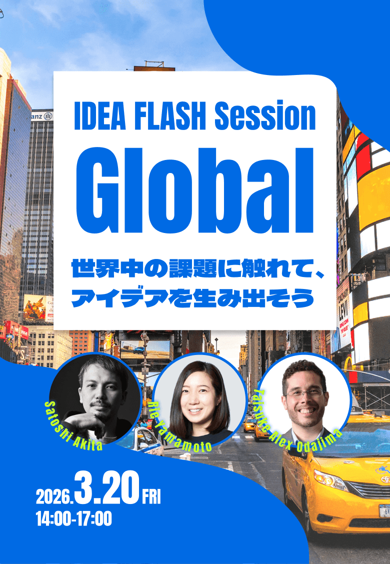 本イベントは、グローバルな挑戦について「学び」「手を動かし」「持ち帰る」体験型イベントです。前半は「なぜ世界で挑戦するのか」「どう生き残っていくのか」という視点から、世界を相手に事業を展開する起業家たちのリアルに触れるパネルディスカッション。後半は、実際のビジネスでも活用されるアイデア創出の手法を用いたワークショップで、自らのひらめきから世界へ挑戦するアイデアの種を生み出していきます。